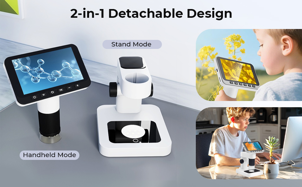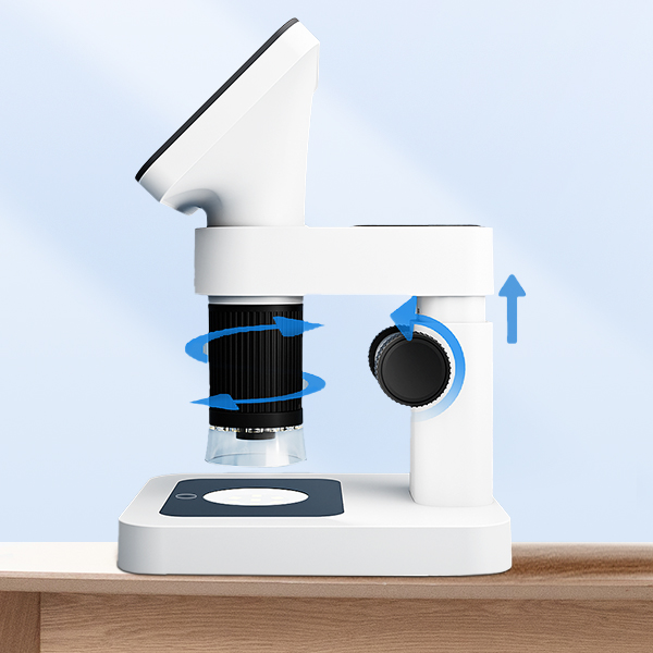 일반적인 핸드헬드 현미경이 휴대용 옵션만 제공하는 반면, 우리 제품은 분리 가능한 핸들과 견고한 베이스를 모두 제공합니다. 야외에서 자연을 탐구하거나 동전 검사와 같은 더 세밀하고 전문적인 관찰을 위해 베이스에 쉽게 놓을 수 있습니다. 게다가 베이스의 스탠드는 높이 조절이 가능하여 다양한 관찰 대상물을 위한 충분한 공간을 제공합니다.