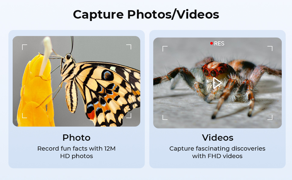 • * 원클릭으로 캡처 및 오래 지속되는 배터리: 버튼만 누르면 아이들이 12MP 사진과 1080P 동영상을 즉시 저장하여 중요한 발견이나 흥미로운 탐구를 풍부한 디테일로 보존할 수 있습니다. 또한, 이 포켓 현미경은 핸들에 1500mAh 배터리와 베이스에 500mAh 배터리를 탑재하여 완충 후 8시간의 탐색이 가능합니다.