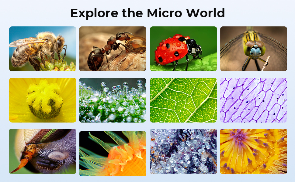 • * 강력한 1000배 확대: 500만 화소 CMOS 칩을 탑재한 휴대용 현미경으로 선명하고 놀라운 이미지를 제공합니다. 최대 1000배까지 조절 가능한 확대 기능으로 자연의 작은 경이를 탐구하기에 완벽합니다. 어린 과학자들이 식물, 곤충 및 작은 생물들의 숨겨진 경이를 가까이에서 발견할 수 있게 해주는 훌륭한 STEM 도구입니다.